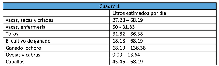 El cuadro 1 muestra las estimaciones de consumo diario de agua de varios grupos de ganado.